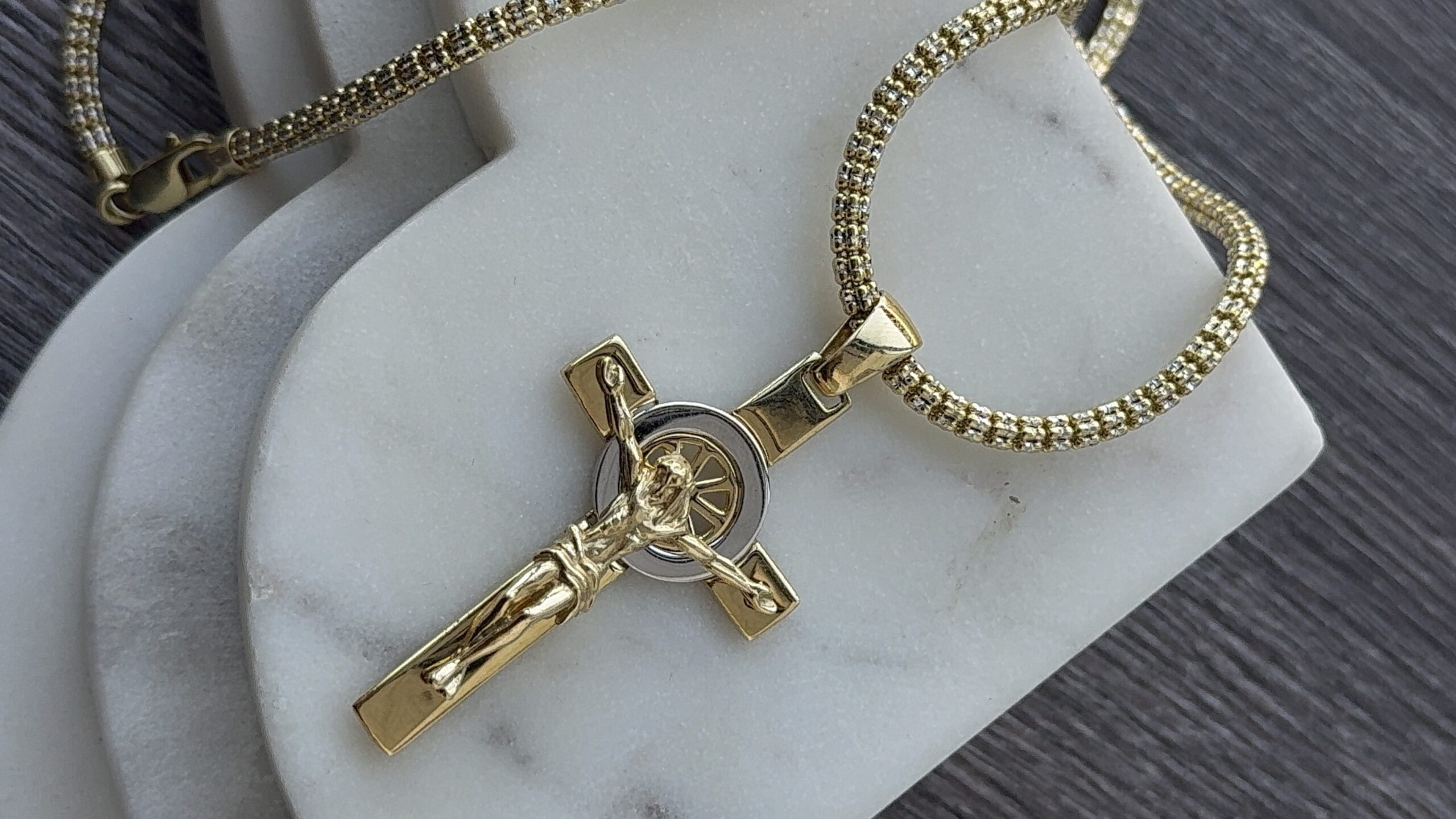 This 18K gold set includes a cross pendant weighing 12 g and a special chain weighing 28.9 g. The elegant cross pendant pairs perfectly with the unique chain, offering a bold and timeless look.